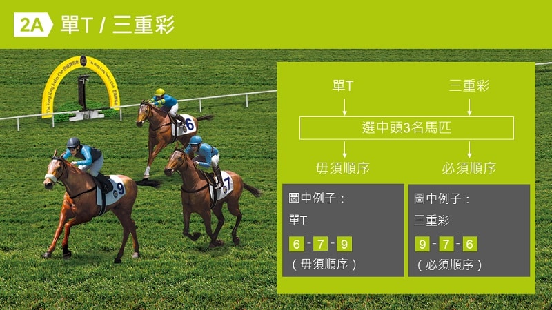 連贏係揀中一場賽事的第1名及第2名馬匹(不需順序),抽水率17.5%。難度中等,適合初學者。三重彩則要求順序揀中第1、2、3名馬匹,抽水率25%。難度極高,但派彩最豐厚。