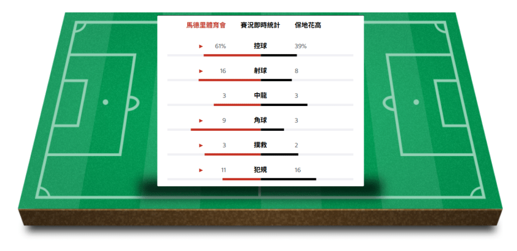門將方面,奧比歷克全場沒有失球;對手門將莊.維克托作出2次撲救。犯規次數顯示比賽對抗性不低,馬體會11次、保地花高16次。唯一紀律處分出現在90分鐘後補時階段,保地花高中場基哥利吃下黃牌。最終馬德里體育會以1比0完成比賽,收下寶貴3分。
