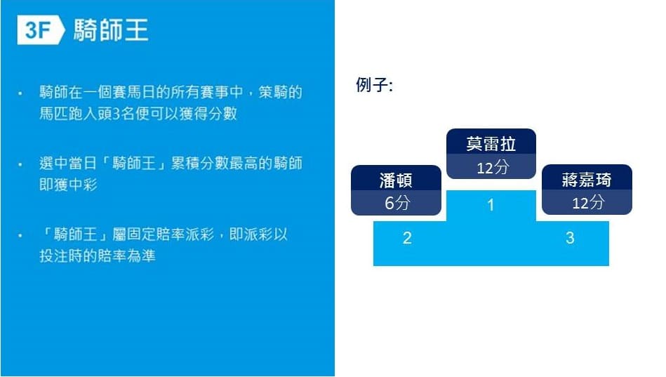 平頭計分:若出現平頭情況,計分方式會有調整。例如兩匹馬平頭第一名,則相關騎師各得9分(而非12分),第三名位置仍維持4分。若兩匹馬平頭第二名,頭馬騎師可得12分,平頭第二名騎師各得5分。