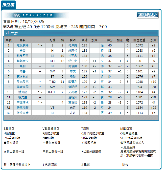 排位布局反映清晰脈絡:電訊驫 獨占 40 分榜首,負重 135 磅,在今場屬唯一真領袖型馬匹。跑法主動、起步穩定,若能順利帶頭,將控制整場步速。