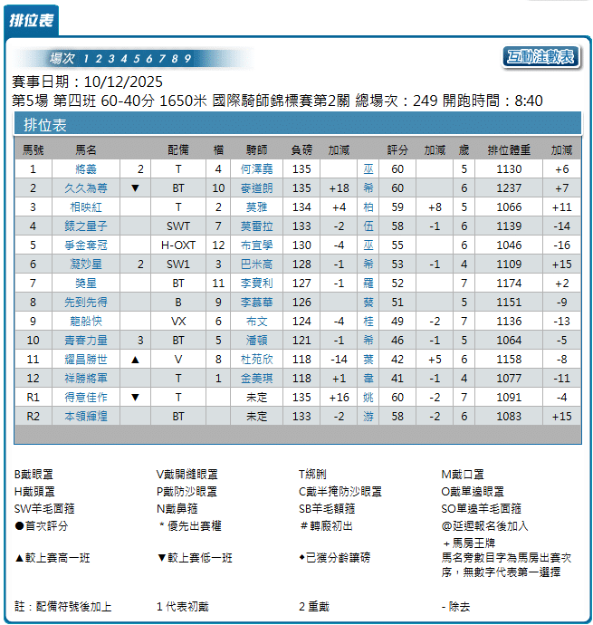 後備馬 R1 得意伴侶 及 R2 本領精星 均帶高負磅候命,一旦補入,將即時對首段節奏構成衝擊。