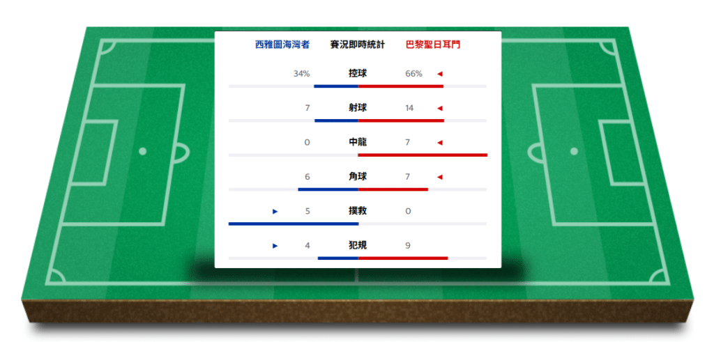 球會世界盃分組賽於6月24日凌晨假世紀互聯球場展開,西雅圖海灣者排出4-2-3-1陣式迎戰4-4-2應戰的巴黎聖日耳門。數據顯示巴黎佔據明顯主導地位,全場控球率達66%,射門14次對7次,中目標7比0,反映雙方進攻效率存在差距。開賽後巴黎持續掌控中場節奏,35分鐘由基華拉斯基利亞完成破門,為客軍先開紀錄;西雅圖未能以任何中龍射門回應,半場以0比1落後。